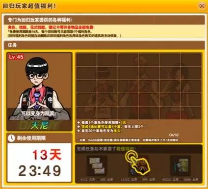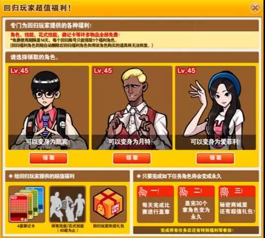 玩家可以在回归界面中领取LV45的福利角色,大尼、亚西、克里斯中的一个。福利角色使用期限为14天,每个账号只可以领取一次福利角色。(福利角色使用期限到期后,将自动删除,其角色身上的所有物品也会随之一起删除,无法恢复)