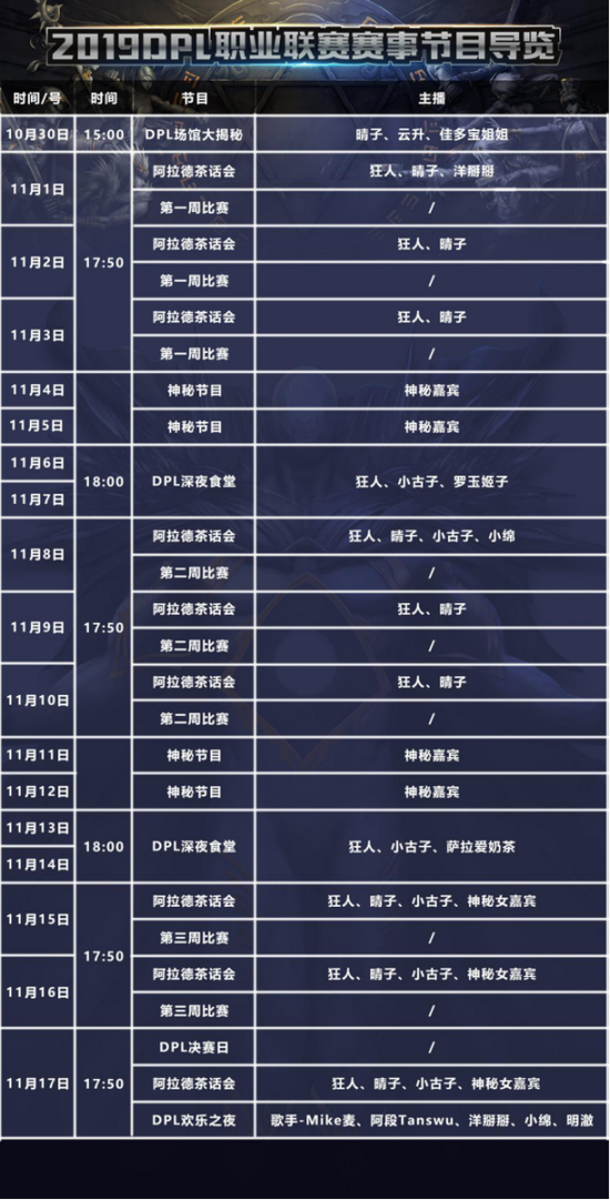 第一周比赛结束后,11月4日、5日还有神秘节目与神秘嘉宾出场,请持续锁定虎牙直播。在每个休赛日的后两天,虎牙倾情打造的《DPL深夜食堂》将带你了解选手们赛场背后的趣味故事,更有狂人搭档小古子、罗玉姬子和萨拉爱奶茶一起聊骚,让大家能与主播、选手近距离接触。