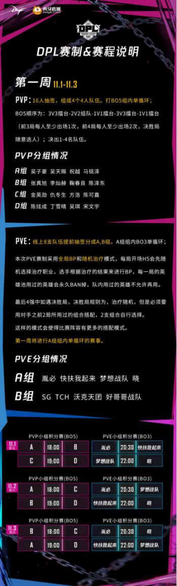 本次DPL联赛分为PVP和PVE两种模式,第一周的比赛将在11月1日~3日进行。目前PVP选手已经分组完毕,各位选手将进行BO5的比拼,并经过3V3擂台-2V2组队-1V1擂台-3V3擂台-1V1擂台的顺序决出1-4名的队伍。