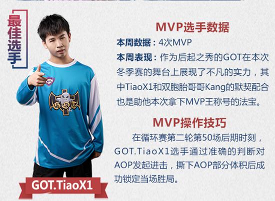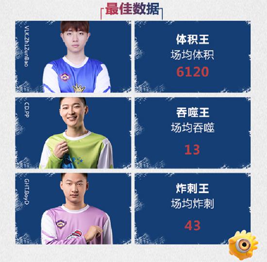 本周最佳数据依然是新秀、老将全面开花。体积王由一直势如破竹的VLK战队Zh1ZunBao拿下,CD的PP和GHT的BoyD则分揽吞噬王和炸刺王。MVP属于当之无愧的GOT队TiaoX1,状态颇佳的他带领队伍一路从上上周的榜四冲到榜一,并成功晋级胜者组第二轮。