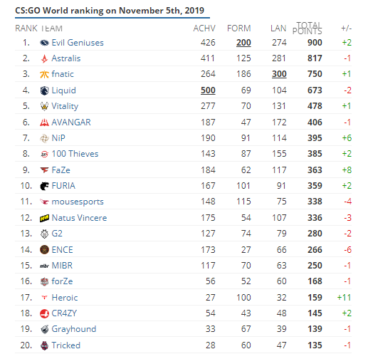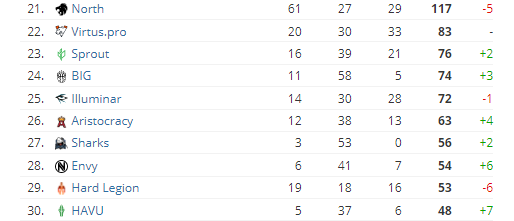 目前排名第一的依旧是Evil Geniuses,第二名则是Astralis,第三名是fnatic。短暂的Liquid王朝目前滑落到了第四名。进步明显的是NIP和FaZe战队,排名分别上升6名和8名。