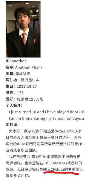 Ana曾在国内开过直播的事情很多人都不知道,不过还是有网友找出了Ana在火猫直播间的个人介绍以及雄心壮志,只可惜Ana“CNdota的梦想”最终却是在OG圆了。