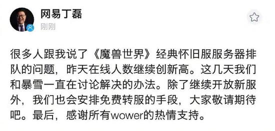 在《魔兽世界》的附图中,网易的CEO丁磊也表示说,在目前《魔兽世界》在线人数屡创新高的情况下,网易也正在积极与暴雪讨论解决方案,除了增加新服务器的措施之外,免费转服的手段也将实施。