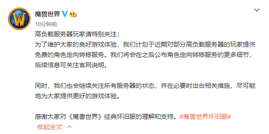 今天(9月3日)《魔兽世界》官方微博发文表示,为了维护玩家们的良好游戏体验,《魔兽世界》计划开启高负载服务器定向转服免费服务,以应对目前部分服务器排队时间过长的问题。