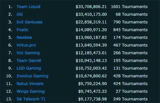 而在电竞俱乐部累计奖金排行榜的前十名中,可以看到很多在Dota 2项目上具有统治力的俱乐部,前二分别是前段时间Dota 2国际邀请赛Ti 9的亚军战队Team Liquid和双冠王战队OG。排名最高的中国俱乐部为排名第5的Newbee,入选前十的中国俱乐部还有排名第7的VG和排名9、10的LGD和iG。在这份榜单上排名最高的英雄联盟俱乐部为排名第13的SKT。
