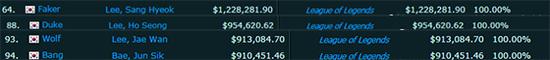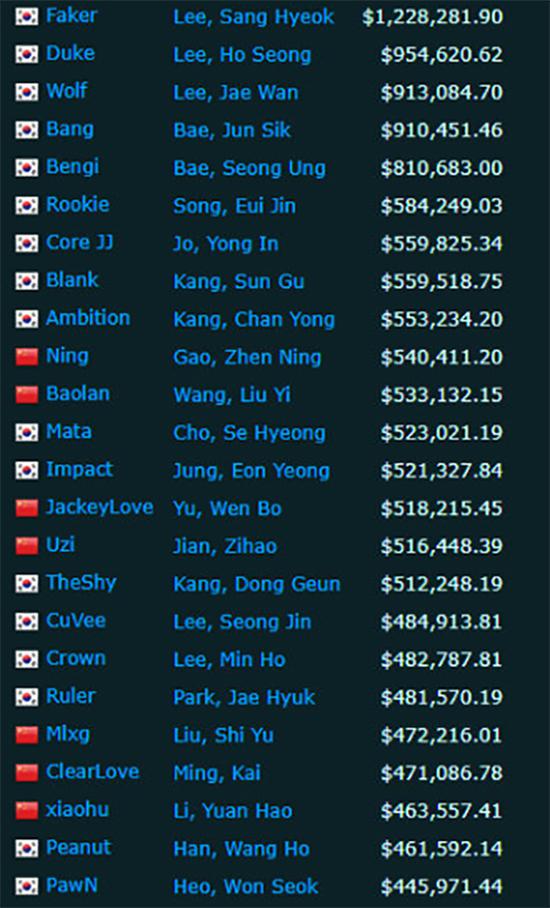 在电竞选手累计奖金排行榜中,Dota 2职业选手霸榜前十,中国排名最高的是来自LGD战队的Dota 2选手Somnus丶M(路垚),积累奖金为$2,916,865.42,位列第15名。而英雄联盟项目共有4位选手进入TOP100,这四名选手或为SKT现役队员或曾经效力过SKT,分别为排名64的Faker、88名的Duke、93名的Bang和94名的Wolf,其中Faker的累计奖金为$1,228,281.90。