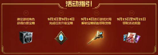 首先我们需要前往活动页绑定自己的游戏角色即可获取白银宝箱,之后我们在9月3日-9月14日通过完成一系列任务来将白银宝箱进行升级,最高可以升级至钻石宝箱。然后在9月14日解锁宝箱钥匙,之后在15日到21日领取2019年战斗之夜的活动奖励。