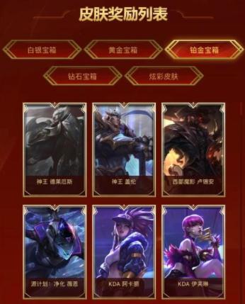 铂金宝箱中的皮肤就比较好了,基本上都是属于系列皮肤,像KDA、源计划、星之守护者这类精品皮肤,其中还有冰雪节限定皮肤,不过能不能抽中还是得看运气了。