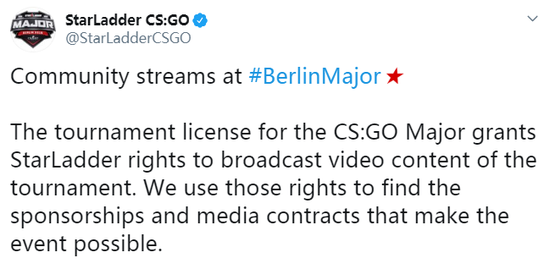 不得不提到 StarLadder 主办的柏林 Major,StarLadder 对于本次 Major 的直播版权做出了严格的把控,在此前一大批 Twitch 主播的直播间因为二次转播 Major 赛事而直接受到了平台的封禁,收到了 DMCA 的违规警告。虽然后来主办方解释到此举也是不得已而为之,因为他们与各地区的合作伙伴签下了独家直播合作的合同。但这种情况引起了不少粉丝的不满,社区对此的讨论也层出不穷。