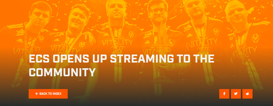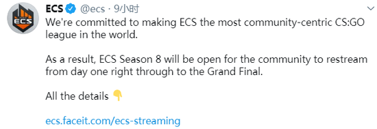 近日,ECS 主办方 FACEIT 在官网发布公告,宣布 ECS S8 赛事的直播版权将会开放给社区,所有的主播都可以在自己的直播间对 ECS 的比赛进行二次直播,这项规则贯穿了 ECS 第一场比赛至总决赛最后一场。在推特上,ECS 说道,“我们承诺 ECS 将会是最以 CSGO 社区为中心的一项赛事”。