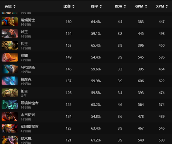 这是他的相关游戏数据,我们可以看到,蝙蝠,斧王,猛犸,末日,军团和伐木机。这是他最熟练同时也是胜率较高的三号位英雄。