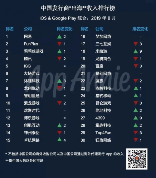 9月12日上午消息,App Annie公布2019年8月中国发行商出海收入排行榜(综合iOS和Google Play),网易、FunPlus、莉莉丝、腾讯、IGG排名前五。