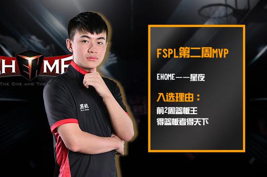FSPL第一周的MVP为来自EHOME战队的绝对值,第二周的MVP依然是EHOME战队的选手星夜,入选的理由很简单,保持全胜且前2周的场均篮板球最高,为2.25个,排名第2的狼晓闪电为2.1个,炎轩椛絮为2.08个。而且星夜也有超强的得分能力,场均10分是所有中锋中得分最多的。