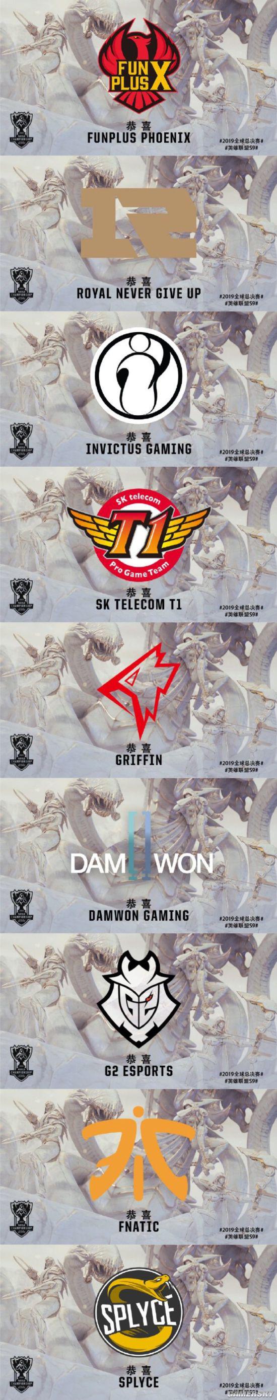 伴随着2019全球总决赛最后一个晋级名额DFM战队出炉,本次全球总决赛全部24支战队全部聚齐,他们分别是:LPL赛区的FPX、RNG、iG战队;LMS赛区的J-team、AHQ、HKA战队、LCK赛区的SKT、GRF、DWG战队;LEC赛区的G2、FNC、SPY战队、LCS赛区的TL、C9、CG战队;土耳其赛区(TCL)的RY战队;大洋洲赛区(OPL)的MMM战队、拉美赛区(LLA)的ISG战队、巴西赛区(BR)的FLA战队、独联体赛区(LCL)的UOL战队、东南亚赛区(LST)的MEGA战队、越南赛区(VCS)的GAM、LK战队以及日本赛区(LJL)的DFM战队。