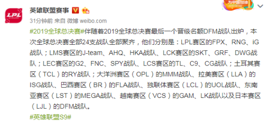 伴随着《英雄联盟》S9总决赛最后一个晋级名额DFM确定,本次全球总决赛全部24支战队全部聚齐。一起来看看各大区分别是哪几支战队杀入了全球总决赛。