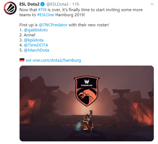 新的一个赛季,ESL One赛事再度归来,而汉堡站将是他们2019-2020赛季的第一个赛事。之前,多次夺得过ESL One冠军的VP战队已经获得了直邀资格,今天,ESL官方公布了第二支接受直邀的队伍——TNC。