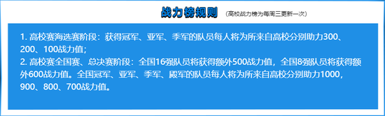 秋季赛新增高校战力榜,赛季末所有为战力榜冠军学校贡献过战力值的本校选手将获得普发BUFF奖励。快快来为你的高校战力添砖加瓦吧!