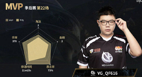本局进入到决赛圈的是VG满编,OMG三人,以及iFTY和LGE各一个独狼。LGE独狼开车进圈被VG发现,一波远点点射,LGE被淘汰出局。最后的梅花桩圈刷在了VG所在的山脚位置,OMG被卡在山上。蓝圈缩小,iFTY独狼倒在了电圈里,低点的VG拉开枪线之后也对OMG展开了攻势。在电网的迫使之下,OMG完全暴露在VG的枪线之下。VG成功吃鸡。