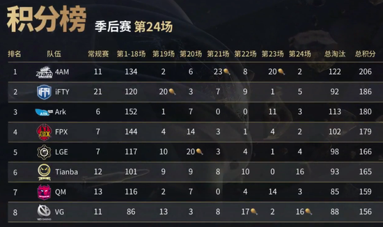 4AM在今天的表现十分强势,吃到两鸡的同时,单日积分超过了70分。回到榜首的同时,4AM也将分差拉到了20分,距离冠军仅有一步之遥。而作为强队,iFTY在今日的表现一人十分稳定,目前位居第二。