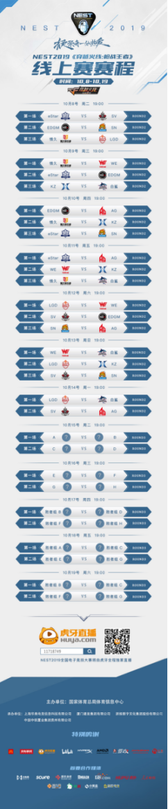 本次NEST2019《穿越火线:枪战王者》项目比赛汇集了国内10支顶尖职业战队。他们将通过10月8日--10月19日为期两周的线上赛比拼,最终决出4支战队晋级到NEST2019冬季线下总决赛。