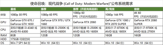 目前《使命召唤:现代战争》官方已经公布了最新的系统配置需求;从配置表中可以看到,想要在1080P下以60FPS流畅体验开启光线追踪的游戏,推荐使用GeForce RTX 2060显卡,而在4K分辨率下,想要开启光线追踪并获得60FPS的极致体验则推荐玩家使用GeForce RTX 2080 SUPER显卡。