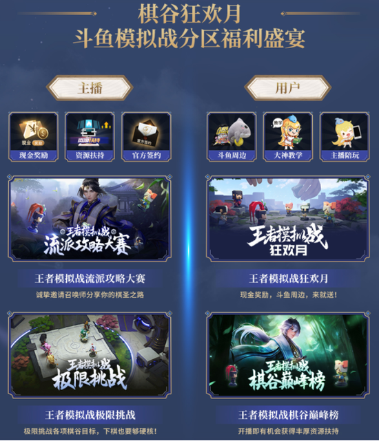 作为全网首个王者模拟战的正式全民级赛事,斗鱼峡谷棋王争霸赛也将于10月19日正式开启。该项赛事不仅有着高达30万的总奖金,而且汇集了模拟战各路的顶级主播及选手。峡谷棋王争霸赛将通过“海选+主播晋级双通道”双通道的形式开展,分为周赛、月赛,以及棋王争霸赛层层晋级。想要在峡谷棋坛和知名主播、职业选手一较高下吗,那就赶快报名参加吧!