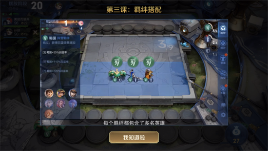 羁绊则是提升阵容强度的主要手段。每个英雄都有“职业”和“阵营”两个羁绊特性。王者模拟战共拥有战士、法师、刺客、坦克、射手、辅助6大职业;魏国、蜀国、吴国、长安、稷下、扶桑、长城守卫军、尧天、群雄9大阵营。
