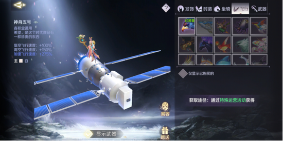 在10月17日至23日内,玩家登陆游戏后即可参与到“完美航天”的飞行活动中——每日在完美世界飞行1000米,即可解锁航天梦想,累计到5个即可获得专属的神舟五号飞行器。在解锁过程中,玩家还能够通过活动中科普的航天知识来加强对航天事业及精神的理解。此外,还有分享奖励等多种玩法机制,等待玩家在飞行领域的进一步探索与挑战。
