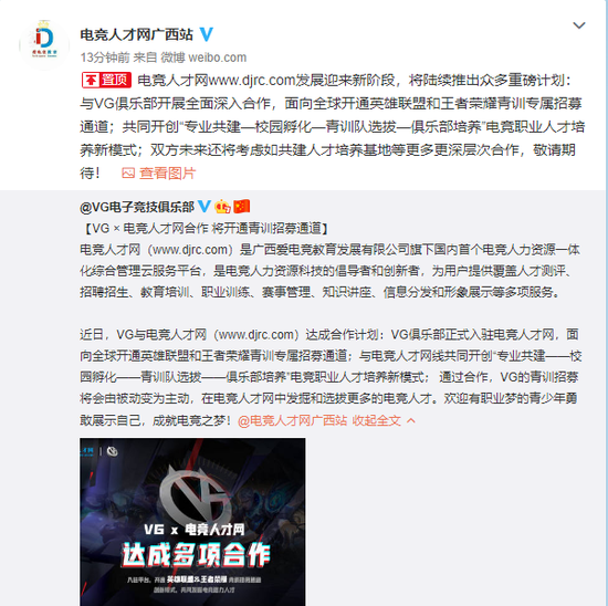 电竞人才网(www.djrc.com)是广西爱电竞教育发展有限公司(以下简称爱电竞教育)旗下国内首个电竞人力资源一体化综合管理云服务平台,为用户提供覆盖人才测评、招聘招生、教育培训、职业训练、赛事管理、知识讲座、信息分发和形象展示等方面的多项专业服务。爱电竞教育长期深耕于中国—东盟(广西)地区的电竞市场,是全国高职院校电竞专业教学标准制定专家组成员单位,是中国电子竞技应用型人才多层次一体化培养模式的开创者,是国内最早开展产教融合、校企联合培养电竞人才的践行者。爱电竞教育旗下拥有爱电竞学院、竞未来电竞人才研究院、爱电竞课程研发中心、爱电竞AI实验室、爱电竞大数据实验室等多个创新引擎,并在广西、贵州地区已与多所公立中、高职院校合作共建电竞专业,积极利用广西区位优势,对接东盟各国合作伙伴共建中国—东盟电竞人才基地。此次与VG俱乐部合作,是国内电竞职业人才培养具有里程碑意义的重大事件,必将为电竞应用型人才的培养开创新的模式!