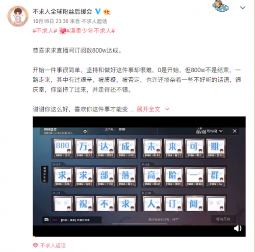 此次不求人订阅数突破800万,其粉丝团9986(求求部落)集体出动,全员出镜,为不求人制作庆贺的视频。