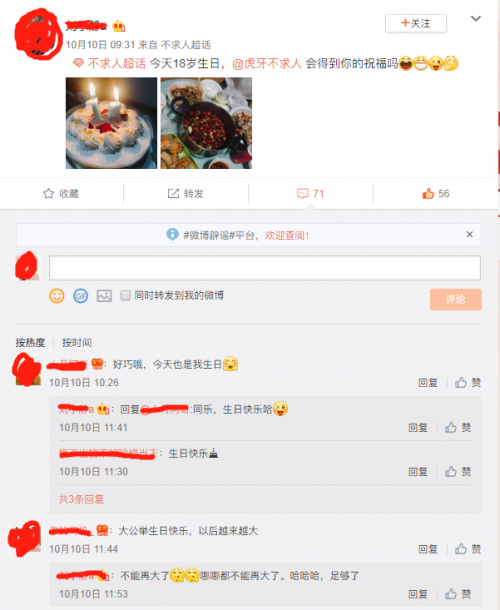 在超话上,有粉丝生日的时候,大家都会集体给他送上祝福,不求人也是经常加入这个祝福的行列。