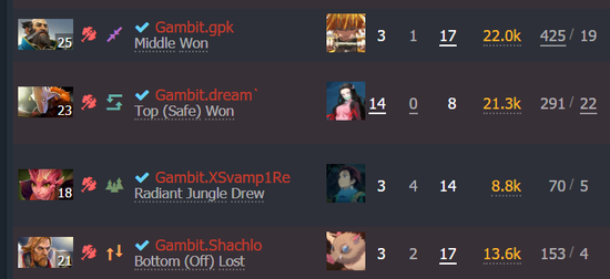 其他场次的比赛中,Liquid延续了Major预选赛的传统,以二比零的比分拿下了NIP——但过程并不轻松,第一把拖了66分钟。但就在击败NIP后,液体却在Gambit的身上摔了个大跟头。别看打TNC的时候平淡无奇,面对快播哥这样的老年选手,红星的中单gpk很快就和对手拉开了差距。第一把,gpk的船长一路杀到超神。第二把,gpk又在对线期把快播哥压得够呛。
