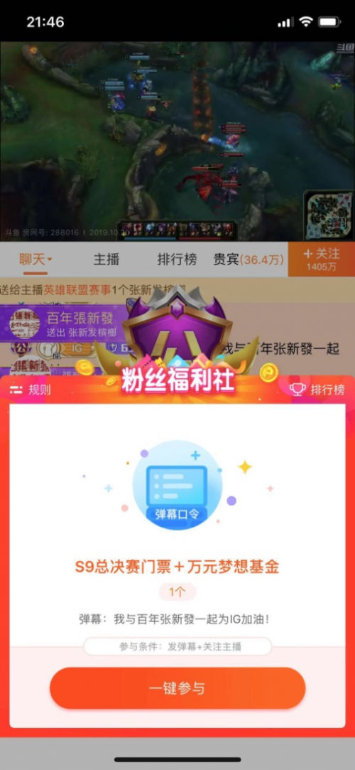 百年张新发槟榔作为斗鱼《英雄联盟》S9全球总决赛的官方合作伙伴,早在19日和20日小组赛的精彩时刻,通过斗鱼S9直播弹幕抽奖送出了两份大礼:“英雄联盟S9总决赛门票+10000元圆梦基金”。获奖的幸运儿,将前往欧洲,现场见证iG的卫冕之路!