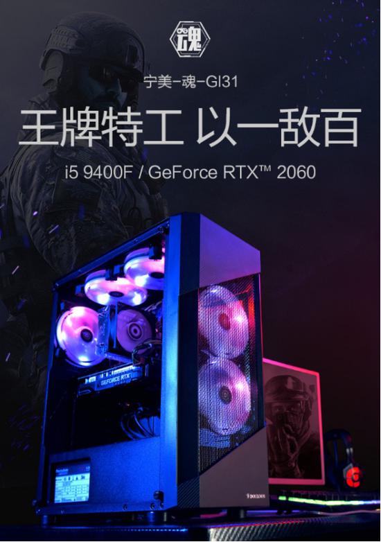 宁美-魂-GI31时尚的蜂巢格栅、全景侧透的机身搭配流线型设计,科技范十足;顶部全面防尘网设计,保证机箱内部整洁、快速散热,提高主机寿命;主流i5 9400F处理器,六核六线程,保证流畅运行;搭载RTX 2060,支持光线追踪和AI智能技术,确保在4K画质下依旧流畅;《战地5》全高特效下,保证游戏操作流畅、画面细腻。畅爽游戏,争做王牌!
