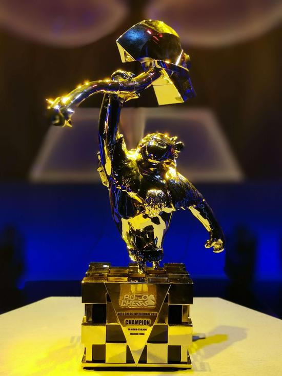 多多自走棋国际邀请赛八强决赛于10月27日下午正式打响,在短暂的开场仪式后,本次赛事的奖杯也正式亮相舞台。奖杯主体以斧王高持利斧为主题,象征着冠军选手经历重重考验,最终从激烈的竞赛中杀出,最终获取独属冠军的荣耀。