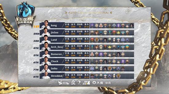 随后是第二局比赛,场面陷入胶着,Chuck的战猎缺乏火枪打底逐步从王座落下,而Kong的战猎装备更好在多人竞逐的乱局中呈现出血量优势,他也不慌不忙地积攒经济上10人口。29与31回合带走了4名玩家,最终的决战在kong与Jinsoo的法师间展开,占据主动的kong在36回合上四海族最终拿下了比赛,为中国选手吃下了今日的第一鸡。
