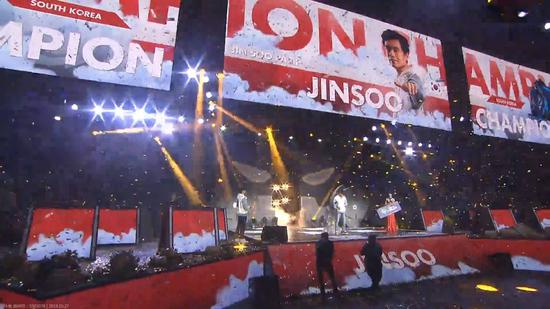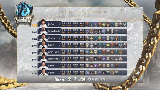 再加上Shredded选手从一路依靠三星爹妈带强袭,从7人口0经济的空城窘境中锁血十几回合爬到前三,场面陷入无比胶着,战至35回合还有五人存活。Shredded选手在赛中不被看好的情况下依靠三星爹妈击败了多位其他选手获得了与Jinsoo决战的机会,Jinsoo做出的三星光法和祭司面对爹妈也无能为力,双方多次互守,但最终还是Jinsoo人口多2,骑士终究有不开盾的时候,他还是收下了这把鸡,但Shredded多次2打9的场面也成为了今日赛事的一个精彩瞬间。