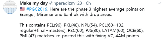 推主Make my day统计了参加PGC的32支战队在各地图的得分情况,PSC、PJS、LATAM、OCE、PML五个赛区进行比较,竞争更为激烈的PEL、PKL、NPL和PCL赛区进行对比。PML赛区战队ahq表现抢眼,艾伦格和米拉玛两张地图得分都排在第一分别获得9.8和惊人的12.8分,萨诺地图Athletico更为强势,场均得分13.3。