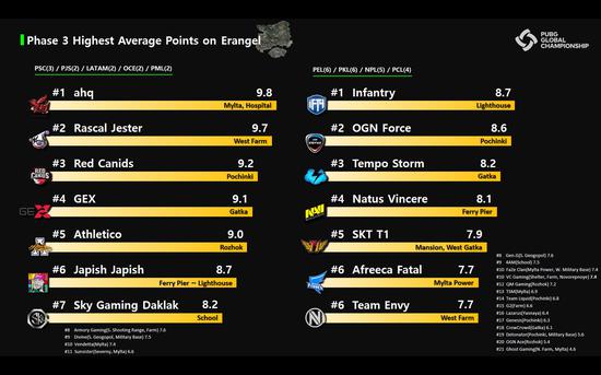 下图是各个PGC参赛队伍第三阶段联赛三张地图平均得分及主要跳点。