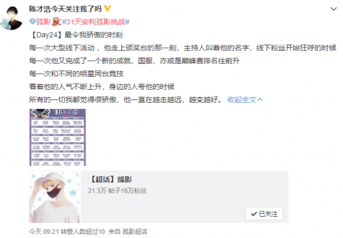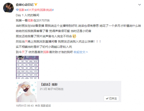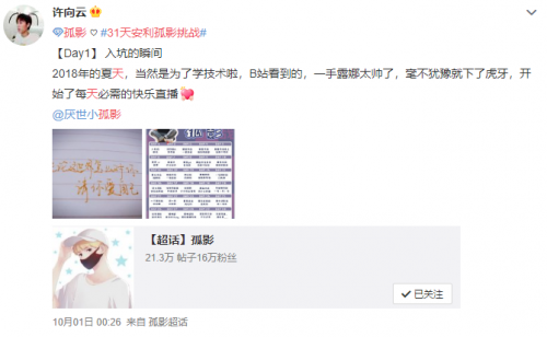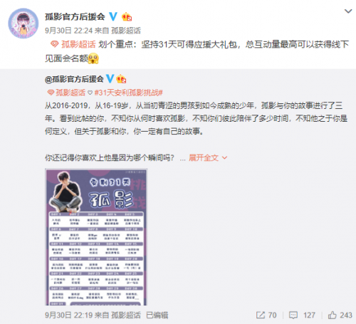 2016年到2019年,孤影从16岁的青涩男孩变成19岁的成熟少年,直播三年来,他的粉丝从0到即将800万。为此,孤影的官方后援会发布一个挑战,那就是#31天安利孤影挑战#,从10月1日到31日,每日在#孤影超话#发帖,完成挑战的朋友有机会获得应援礼包以及深圳线下见面会名额。