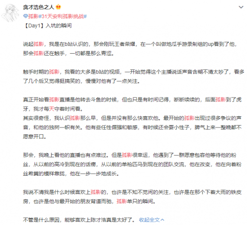 有些粉丝是从孤影还是一个小主播时就开始关注他,有些粉丝是他冲了几个国服英雄后开始了解他,有些粉丝是看到他的颜就喜欢他,也有些粉丝喜欢他的普通话以及他的歌声。不管是何时开始关注孤影,不管是因何事关注孤影,粉丝和孤影的缘分就此建立了。不知孤影之于你是何定义,但关于孤影和你的故事,也许早就开始,也许从这篇文章开始,希望不要结束。
