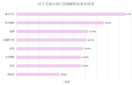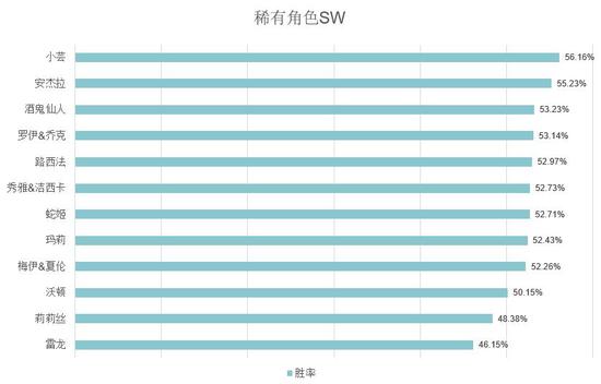 最后我们看SW,稀有角色中胜率最高的居然又是小芸?安杰拉紧随其后,中间一部分角色胜率均在52%-53%之间。热门角色中,千岁胜率第一,其中胜率较高的SW均为女性角色。