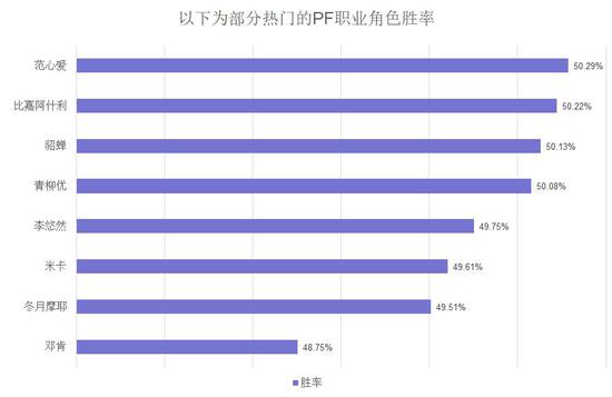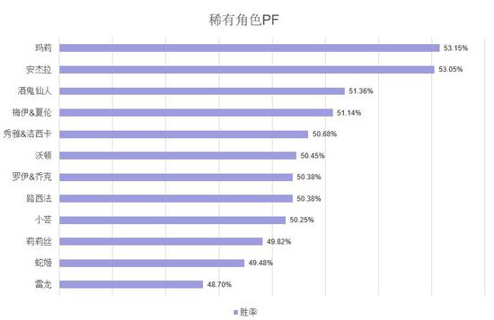 接下来是PF,全部稀有角色中,玛莉和安杰拉的胜率略高于其它稀有角色,但胜率仍然在正常范围内。随机选择的热门角色中大部分的角色胜率都维持在49.5%-50%+