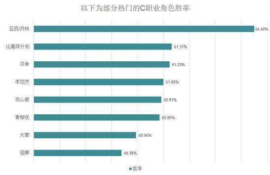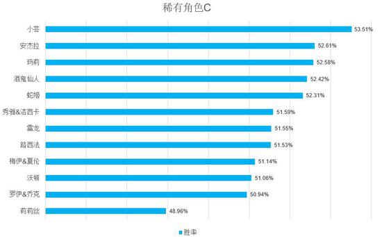 首先是C,全部稀有角色中,胜率第一位的居然是最早的稀有角色小芸,可能让大家有些意外。而热门角色中亚西/月特的胜率甚至已经超过了小芸,达到了54.49%。