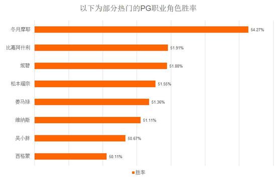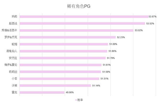 接下来是PG,全部稀有角色中,玛莉、路西法、秀雅&洁西卡的胜率略高于其它稀有角色,这三个角色胜率都达到了53%以上。热门角色中,冬月的胜率居然达到了54.27%,超过所有稀有角色,其它热门角色胜率也均超过50%。有趣的是下列角色中胜率唯一低于50%的是雷龙~