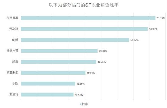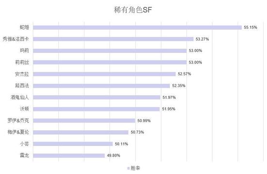 继续看SF,蛇姬的胜率一骑绝尘,达到55.15%,秀雅&洁西卡、玛莉、莉莉丝的胜率为53%左右。热门角色中,冬月作为万金油外线角色,胜率高于其它角色一些,能和部分稀有角色的胜率一较高下。