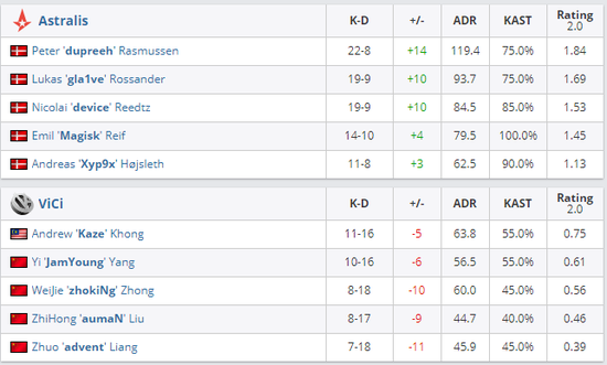 图二来到Astralis选择的Nuke,仅仅是在进攻方时,Astralis就完全击穿了VG在外场的防守,随后Astralis的进攻随意展开,VG战队却很难做出应对措施,只能与随处可见的土匪正面刚枪,虽然zhokiNg和Kaze时有亮眼发挥,但还是敌不过Astralis在这张图上统治级别的发挥。接下来在进攻阶段,打出手感的Astralis众人几乎是靠着各自的个人能力将比分定格在了16-4,最终总比分2-0击败了VG。