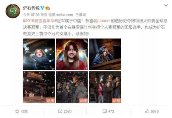 据官方消息显示,@Liooon狮酱是首个在暴雪嘉年华夺得个人赛冠军的国服选手,同时还是炉石电竞史上首位夺冠的女选手。获奖后狮酱也通过微博分享了获胜的喜悦并晒出了冠军奖杯。