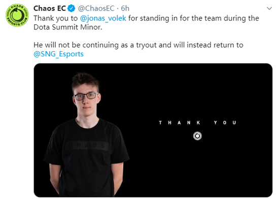 今天凌晨,Chaos发布公告,宣布试训的三号位SabeRLight将返回SNG战队。