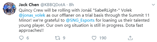在取得巅峰联赛Minor参赛资格后,SumaiL因为种种原因离开了QC战队,因此队伍从SNG战队找来了SabeRLight作为替补,同时也是一次试训,如果SabeRLight表现出色,可能就会被QC战队买来。
